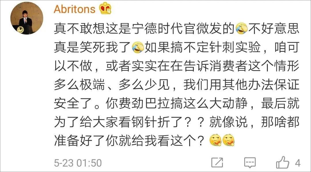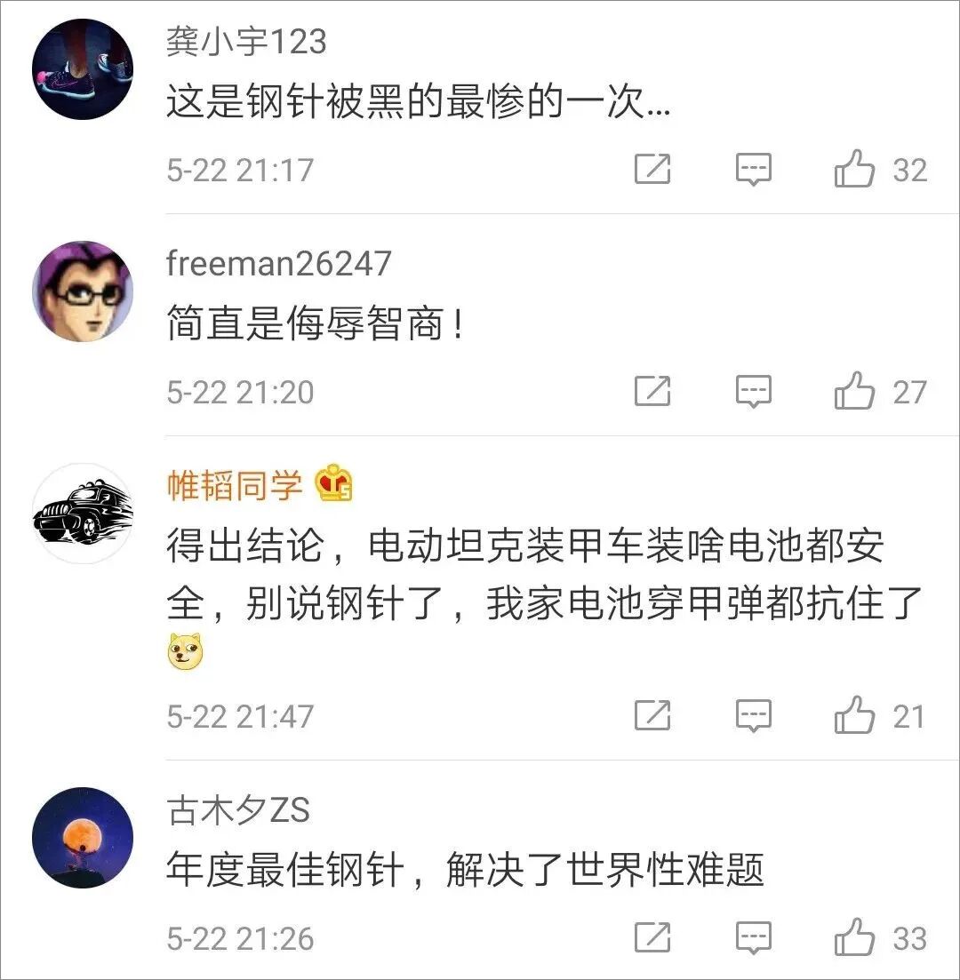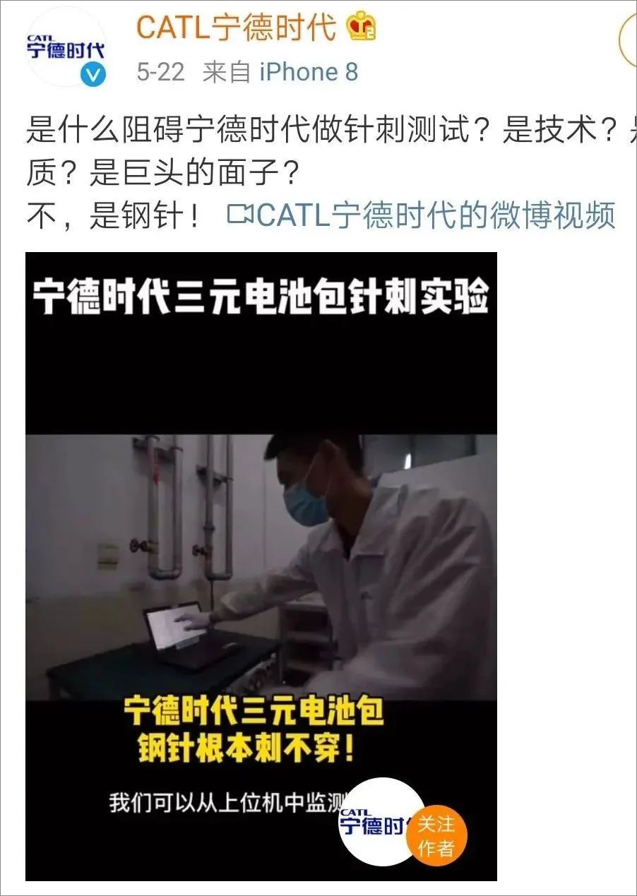 好像是感受到了视频内容对自己不利,5月22日,宁德时代旋即发布了一条微博,内容大致如下:是什么阻碍宁德时代做针刺测试?是技术?是体制?是巨头的面子?不,是钢针!