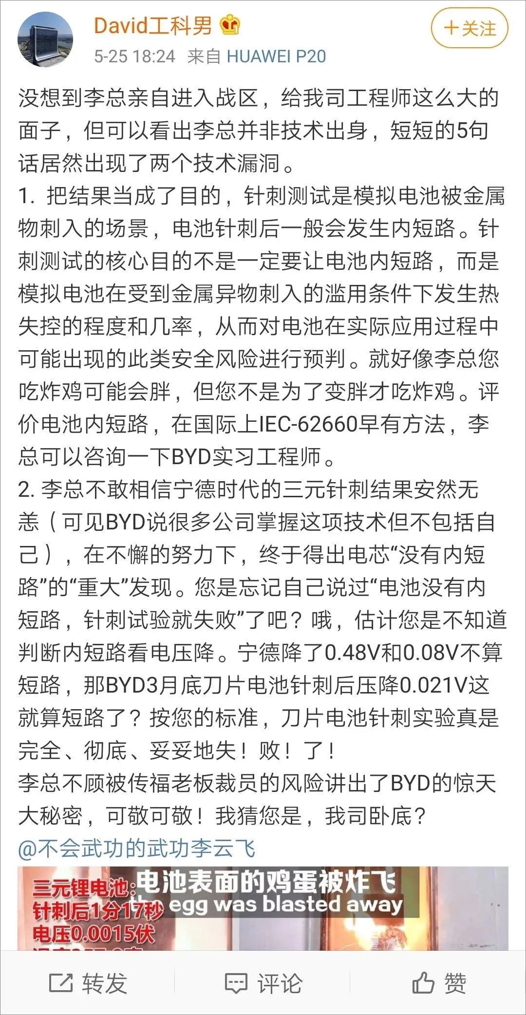 看到这儿,比亚迪销售公司副总李云飞坐不住了,觉得这是在针对比亚迪。他们3月发布刀片电池时,曾在发布会上发布了针刺实验的视频。